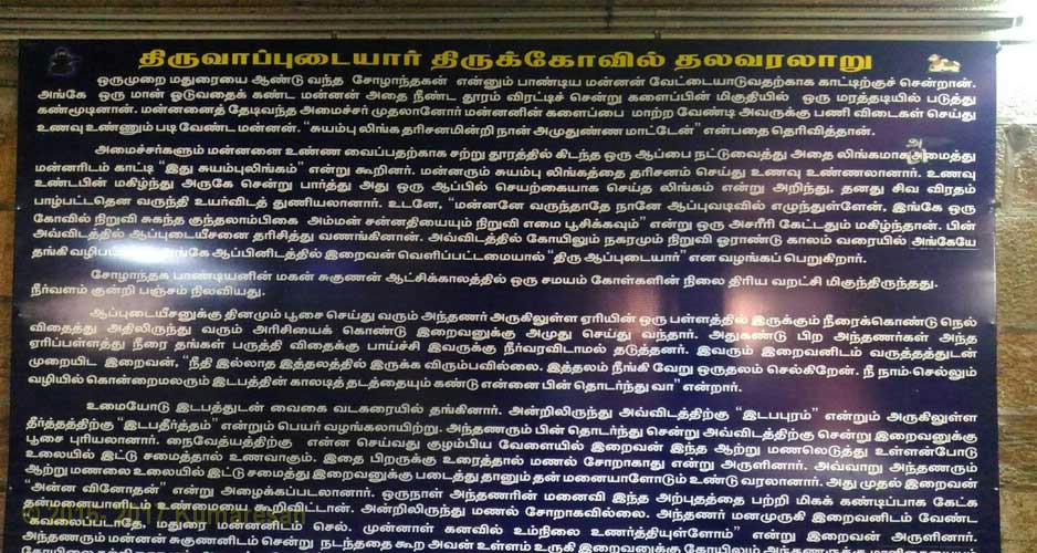 சோழாந்தகன் என்ற பாண்டிய மன்னன் ஒரு சிவபக்தன். இவன் எப்போதும் சிவபூஜை செய்த பின்பு தான் சாப்பிடுவான். ஒரு முறை வேட்டையாட காட்டிற்குச் சென்ற அரசன் வேட்டையாடிய களைப்பால் நடு காட்டில் விழுந்து விட்டான். பயந்து போன இவனது பாதுகாப்பு வீரர்கள், மன்னனின் களைப்பு தீர உணவை அருந்த கூறினர். ஆனால் சிவபூஜை செய்யாமல் சாப்பிடமாட்டேன் என்பதை உறுதியாக தெரிவித்தான். புத்திசாலி அமைச்சர் ஒருத்தர், அந்த காட்டில் கிடைத்த மரத்துண்டு ஒன்றை எடுத்து தரையில் ஆப்பு அடித்தார். அதைக்காட்டி, "மன்னா, இங்கே ஒரு சுயம்பு லிங்கம் உள்ளது. நீங்கள் அதை பூஜை செய்த பின் உணவருந்தலாமே,"' என்று யோசனை கூறினார். களைப்பிலிருந்த மன்னனும் அந்த ஆப்பை சுயம்புலிங்கம் என நினைத்து வணங்கி உணவருந்தி விட்டான். களைப்பு நீங்கிய பிறகு தான், தாம் வணங்கியது லிங்கம் அல்ல, அது ஒர் ஆப்பு என்பதை உணர்ந்து மிக வருந்தினான். சிவபூஜை செய்யாமல் உணவருந்திய வருத்தத்தில் இறைவனிடம் தான் இதுநாள் வரை இறைவனை பூஜித்தது உணமையானால் இந்த ஆப்பில் வந்து என்னை அருள்பாலிக்க வேண்டும் என்று வேண்டினான். அப்படி இல்லாவிட்டால் உயிர் துறக்கவும் தயாரானான். மன்னனின் பக்திக்கு மகிழ்ந்த இறைவன் அந்த ஆப்பிலே தோன்றி அருள் பாலித்தார். சிவன் ஆப்பு உடையார் ஆனார். அந்த ஊர் ஆப்பனூர் ஆனது. கோவிலும் ஆப்புடையார் கோவில் என்று சிறப்புற்றது.