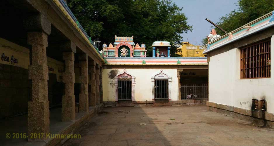 இவ்வாலயத்திற்கு கோபுரமில்லை. ஒரு முகப்பு வாயில் மட்டுமே உள்ளது. முகப்பு வாயிலின் மேற்புறத்தில் ரிஈபாரூடராக சிவன், பார்வதி, முருகர் மற்றும் விநாயகம் சுதை வடிவில் காணப்படுகின்றனர். வாயில் வழியே உள்ளே நுழைத்தவடம் காணப்படமு மண்டபத்திர் கொடிமரம், பலிபீடம், நந்தியைக் காணலாம். இறைவன் சந்நிதி கிழக்கு நோக்கி அமைந்துள்ளது. அம்பாள் சந்நிதிக்கும், சுவாமி சந்ந்திக்கும் இடையில் சுப்பிரமணியருக்கு சந்நிதி உள்ளது. இத்தகைய அமைப்பை சோமஸ்கந்த அமைப்பு என்பர். பிரகாரம் சுற்றி வரும்போது தலவிருடசம் வன்னி மரத்தடியில் விநாயகர் தரிசனம் தருகிறார். வள்ளி தெய்வானை அருகிலிருக்க முருகர் மயில் அமர்ந்து காட்சி தருகிறார்.