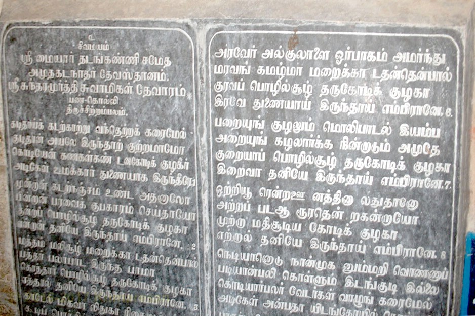 கடிதாய்க் கடற்காற்று வந்து எற்றக்கரைமேல் குடிதான் அயலே இருந்தால் குற்றமாமோ கொடியேன் கண்கள் கண்டன கோடிக் குழகீர் அடிகேள் உமக்கு ஆர்துணையாக இருந்தீரே.