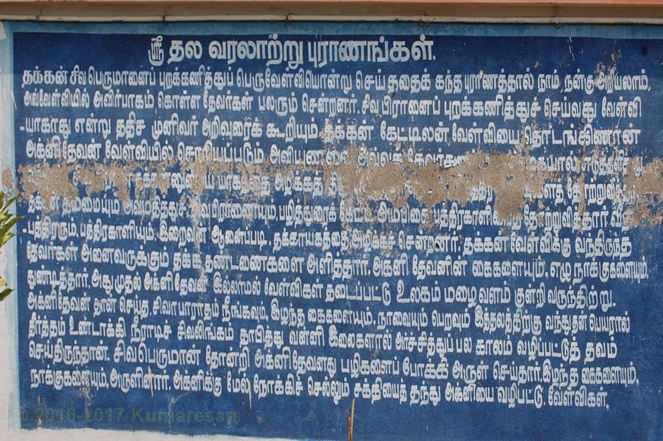 சிவபெருமானை புறக்கணித்துவிட்டு மற்ற அனைவரையும் அழைத்து தட்சன் யாகம் நடத்தினான். யாகத்தில் கலந்து கொண்டவர்களில் அக்னி தேவனும் ஒருவன். சிவனை அவமதித்து நடத்தப்பட்ட யாகத்தில் கலந்து கொண்டதற்காக இவன் பத்ரகாளியாலும், வீரபத்திரராலும் தண்டிக்கப்பட்டு சாபம் பெற்றான். அக்னிக்கு சாபம் ஏற்பட்டதால் எந்த யாகத்திலும் கலந்து கொள்ள முடியவில்லை. யாகம் நடத்தப்படாததால், மழைவளம் குன்றியது. உயிர்கள் வாட தொடங்கின. இதனால் வருந்திய அக்னி தேவன், பல தலங்களில் ஈசனை வழிபட்டு தனக்கு ஏற்பட்ட சாபத்திலிருந்து மீள வேண்டினான். அச்சமயம் இத்தலத்திற்கும் வந்து லிங்கம் அமைத்து, தீர்த்தம் உண்டாக்கி, வன்னி இலைகளால் இறைவனை அர்ச்சித்து சாபம் நீங்கப் பெற்றான். அக்னி தேவன் வழிபட்ட தலமாதலால் இறைவன் அக்னிபுரீஸ்வரர் ஆனார். அக்னி உண்டாக்கிய தீர்த்தம் அக்னி தீர்த்தம் என்று பெயர் பெற்றது. அக்னிதேவன் தனக்கு அருள் புரிந்த அக்னீ ஸ்வரரை வணங்கி, இத்தலத்திற்கு வந்து அக்னி தீர்த்தத்தில் நீராடி வழிபடுவோருக்கு தன் தொடர்புடைய உஷ்ண ரோகங்கள் நீங்கவும், நற்கதி பெறவும் அருள்புரியுமாறு இறைவனை வேண்டினான். எனவே உஷ்ணம் சம்பந்தப்பட்ட நோய், ரத்த கொதிப்பு உள்ளவர்கள் இங்குள்ள தீர்த்தத்தில் நீராடி சிவனுக்கு கோதுமையால் செய்த பொருளை நிவேதனம் செய்து வழிபட்டால் விரைவில் குணமாகும்.