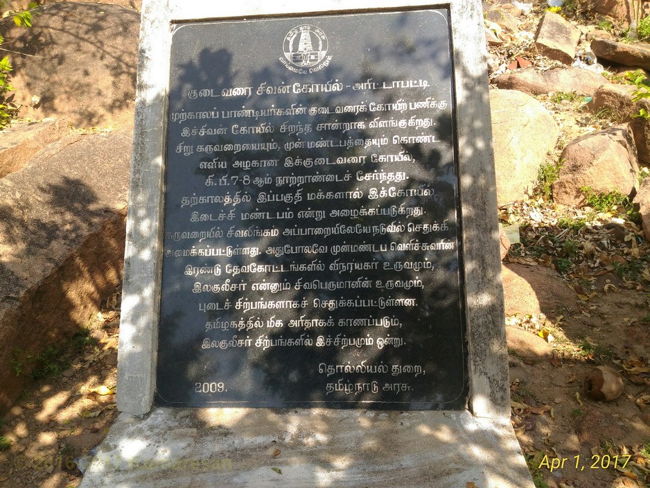 மதுரையைச் சுற்றி பாண்டியர் காலத்தில் நிறைய குடைவரைக் கோயில்கள் உருவாக்கப்பட்டன. திருப்பரங்குன்றம், பிள்ளையார்பட்டி, கழுகுமலை வெட்டுவான்கோயில் எல்லாம் பாண்டியர் காலத்தைச் சேர்ந்தவை என்றே நினைக்கிறேன். இரண்டாயிரம் ஆண்டு தொன்மையான சான்றுகளை இவ்வூர் கொண்டுள்ளது. இங்குள்ள பாண்டியர்கால குடைவரைக் கோயில் ஏழாம் நூற்றாண்டைச் சேர்ந்தது. மலையைக் குடைந்து மிகப்பெரிய சிவலிங்கம், வாயிலில் துவாரபாலகர்கள், குடைவரையின் வெளிமுகப்பில் பெரியபிள்ளையார், இலகுலீசர் சிலையும் உள்ளது. மிகவும் அரிதான சிவனின் இலகுலீசர் சிற்பம் இங்கு காணப்படுகிறது. இக்கோயிலுக்கு எதிரில் உள்ள மலையிலிருந்து கொண்டு வரும் சுனைநீரிலிருந்துதான் சிவனைக் குளிப்பாட்டுகிறார்கள். எனவே இந்தச் சுனை நீரை இக்கோயில் தீர்த்தச்சுனைநீர் எனலாம். குடைவரைக்கு அருகே ஒரு சிறுகுகை ஒன்று உள்ளது. ஒருவர் மட்டும் உள்ளே படுக்கலாம். உள்ளே படுத்துப் பார்த்தால் மிகவும் குளுமையாக இருந்தது. அதன் அருகே பெண்தெய்வம் சிறு மண்டபத்திலுள்ளது. இந்த ஊர் மக்கள் இவ்விடத்தை இடைச்சிமண்டபம் என்கின்றனர்.