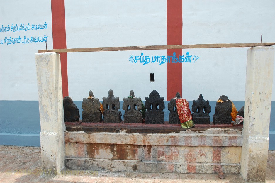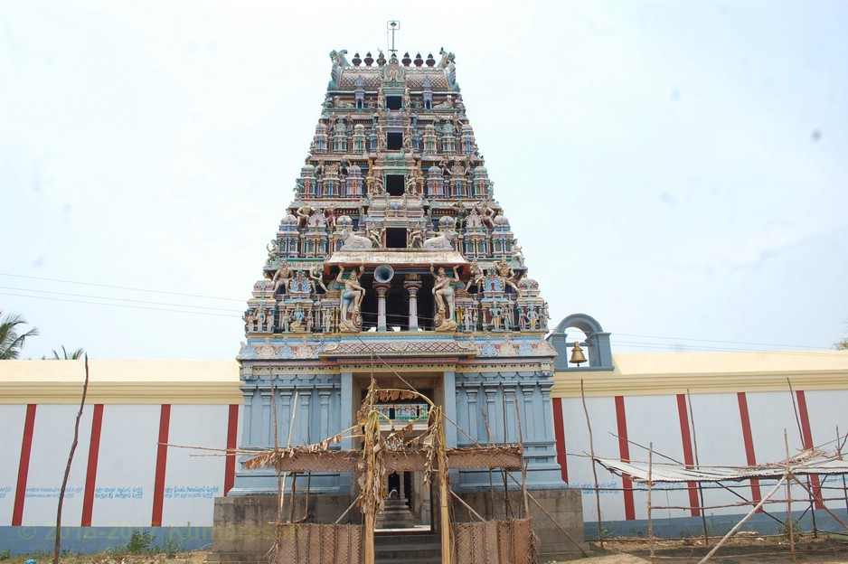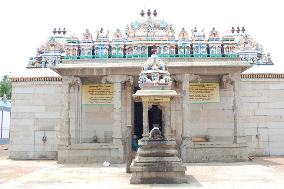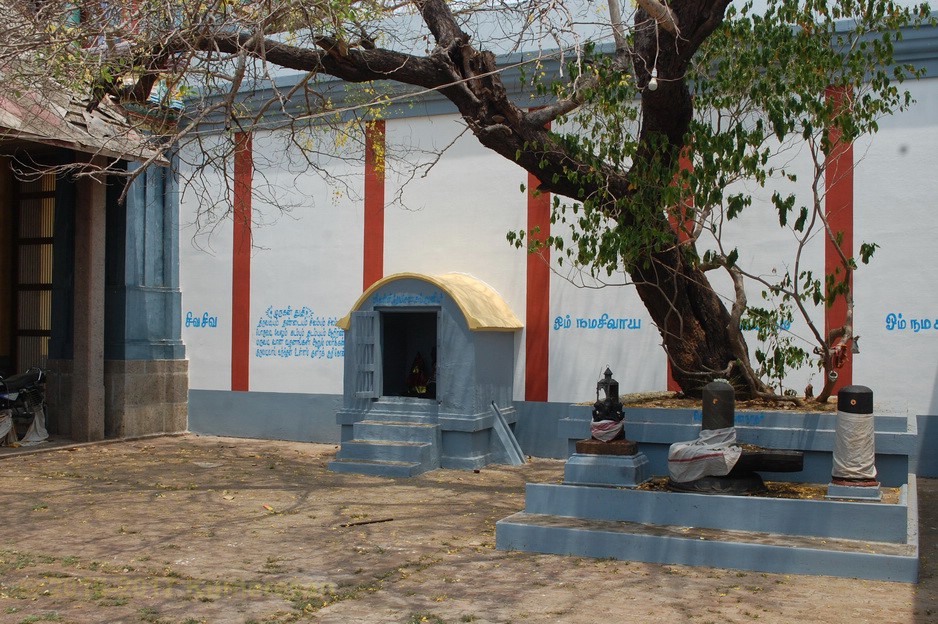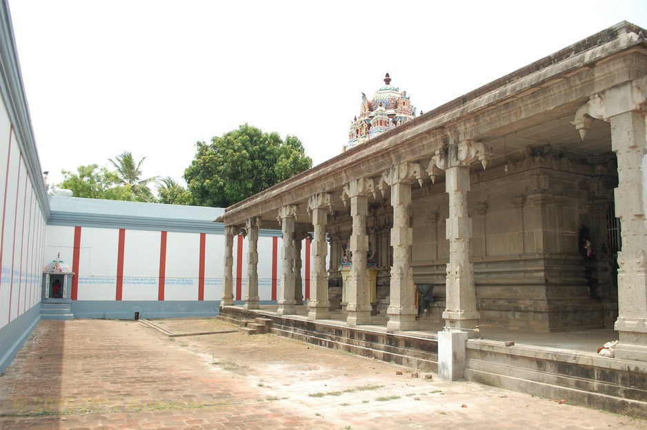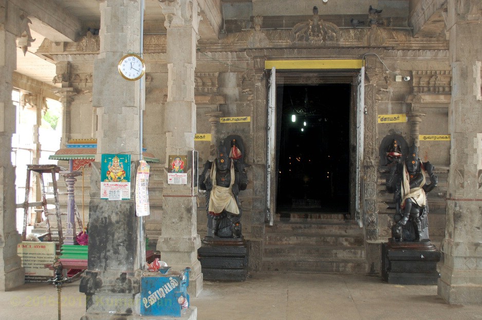 வெளி மண்டபத் தூண் ஒன்றிலுள்ள ஆஞ்சனேயர் வாலில் மணியுடன் காணப்படுகிறார். அருகிலுள்ள மற்றொரு தூண் அருகே உள்ள தவழும் கிருஷ்ணனின் திருமேனியும் காணத்தக்கது. அம்பாள் சந்நிதி பக்கத்தில் தனிக்கோயிலாகவுள்ளது. சூரியன் விநாயகர், சுப்பிரமணியர் சந்நிதிகள் உள்ளன. நந்தி சற்று உயரத்தில் உள்ளது. படிகளேறிச் சென்றால் கருவறை முன் மூஞ்சூறு வாகனத்தின் மீது அமர்ந்துள்ள விநாயகரையும், தண்டபாணியையும் துவாரமூர்த்திகளாகத் தரிசிக்கலாம். நேரே அம்பாள் நான்கு திருக்கரங்களுடன் கூடிய நின்ற திருக்கோலத்தில் அருட்காட்சி தருகிறாள்.