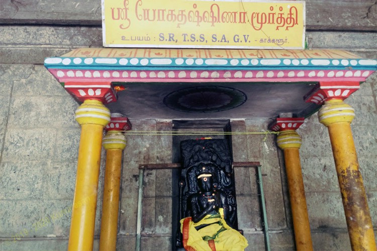 இங்குள்ள தட்சிணாமூர்த்தி யோக தட்சிணாமூர்த்தியாக சின் முத்திரையை இதயத்தில் வைத்து காணப்படுகிறார். வலது காலை மடித்து பீடத்தில் வைத்து, இடது கையை ஆசனத்தில் அழுத்திக் கொண்டு, கணகளை மூடிக் கொண்டு கல்லால மரத்தின் கீழ் சனகாதி முனிவர்களோடு, பாதத்தில் முயலகன் அழுந்திக் கிடக்க மிக அமைதியாக அமர்ந்திருக்கின்ற இவரது சிற்பம் பார்த்துக் கொண்டே இருக்கத் தோன்றும்.