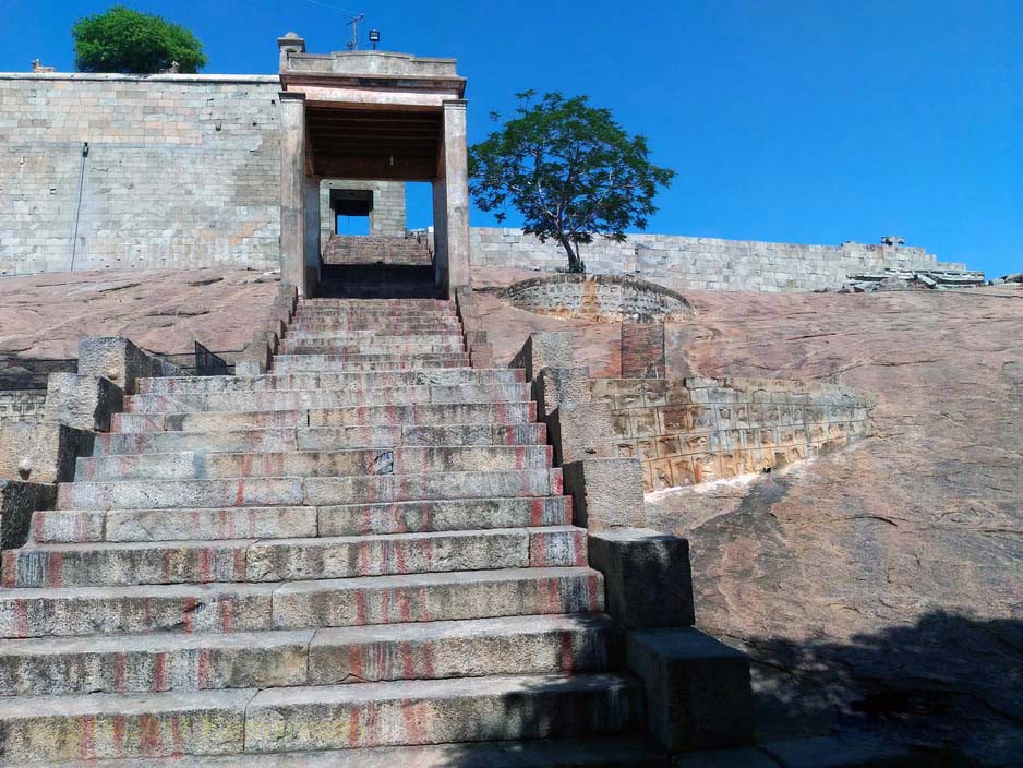 சுமார் 250 அடி உயரமுள்ள குன்றின் மீது கோவில் அமைந்துள்ளது. மேலே செல்ல 125 படிக்கட்டுகள். இடையே இளைப்பாற மண்டபங்கள் உள்ளன.குன்றின் கிழக்கு நுழைவாயிலின் இடதுபுறம் செல்வ விநாயகரும், வலப்புறம் ஆஞ்சநேயரின் சன்னதிகளும் உள்ளன. இங்கிருந்து பார்த்தால் திருச்சி மலைக்கோட்டையின் ரம்மியமான தோற்றம் கண்களைக் கவரும். கோவிலுக்கு முன்னே கொடித்தூண், பலிபீடம் நந்தி மண்டபம் உள்ளன. கருவறைக்கு முன் முக மண்டபமும், அதனையொட்டி திருச்சுற்றும் உள்ளன. திருச்சுற்றில் முருகன், சப்த கன்னியர், பிள்ளையார், காசி விசுவநாதர், கஜலட்சுமி, சண்டிகேசுவரர், நவக்கிரகங்கள், ஆடல்வல்லான், சு ரியன் ஆகிய தெய்வங்களை தரிசிக்கலாம்.