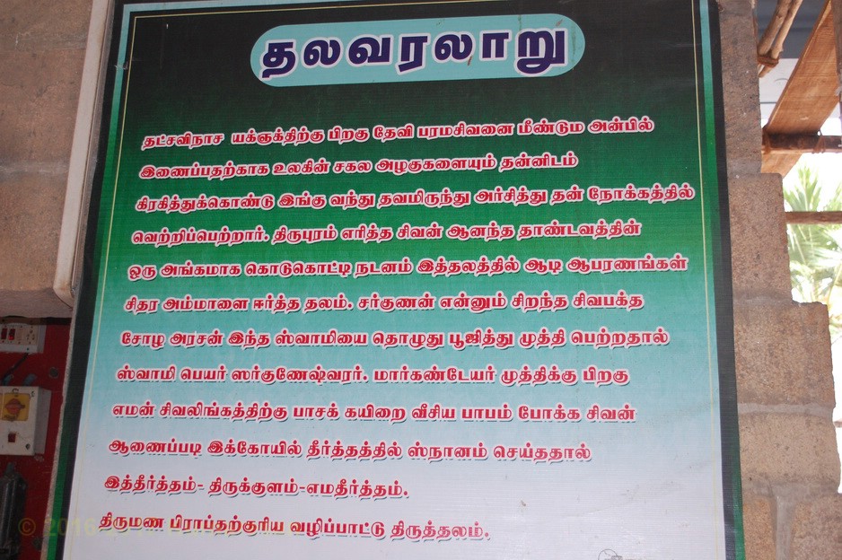 ஓர் ஊரில் சில காலம் இருந்த அம்பிகை பின் இங்கு வந்து சர்வாங்க சுந்தரியாக இறைவனின் முன் நின்றாளாம். இவளைத் தரிசித்த இளம்பெண்களின் கல்யாணம் உடனே ஆகிவிடுகிறது என்றும், குழந்தை இல்லாதவர்க்குக் குழந்தை பிறக்கிறது என்றும் சொல்கிறார்கள். கங்கையைச் சடையில் கொண்ட ஈசனின் சிற்பம் குளத்தின் நடுவில் அமைக்கப்பட்டுள்ளது.