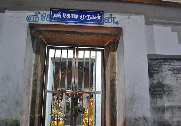 கோடி விநாயகர் மற்றும் கஜலட்சுமி சன்னதிகள் உள்ளன. உட்பிரகாரத்திலுள்ள முருகப் பெருமான கோடி சுப்பிரமணயர் என்ற பெயருடன் உள்ளார். இவர் ஒரு திருமுகத்துடனும் நான்கு திருக்கரங்களுடனும் தனது தேவியர் இருவருடன் கிழக்கு நோக்கி எழுந்தருளியுள்ளார்.