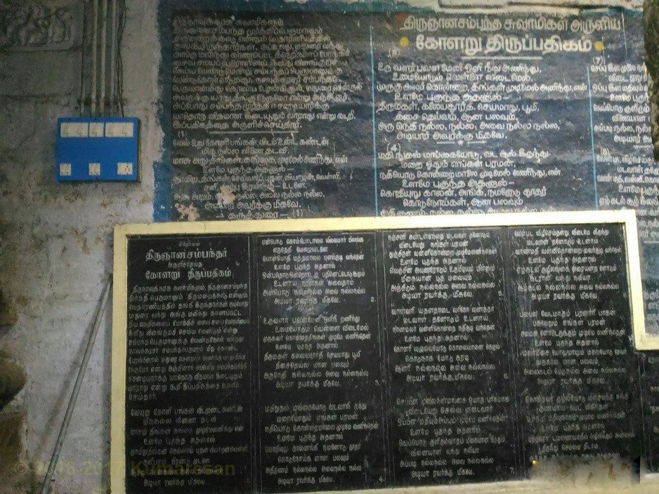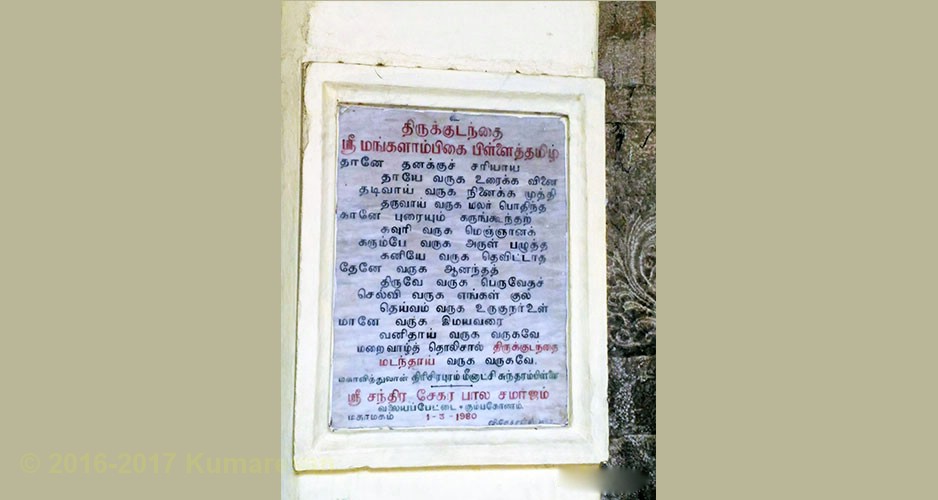 இதில் சொல்லப்பட்டுள்ள செய்திகள் - திருக்குடந்தை ஆதி கும்பேசர் செந்தாமரைக்குளம் கங்கை மகம் காவிரிக்கரையின் ஓரம் கீழ்க்கோட்டம் காரோணமங்கை நாயகியார் சாரங்கபாணி தலம் . (காரோணம் = மந்திர மேடை, மந்திர பீடம்,)