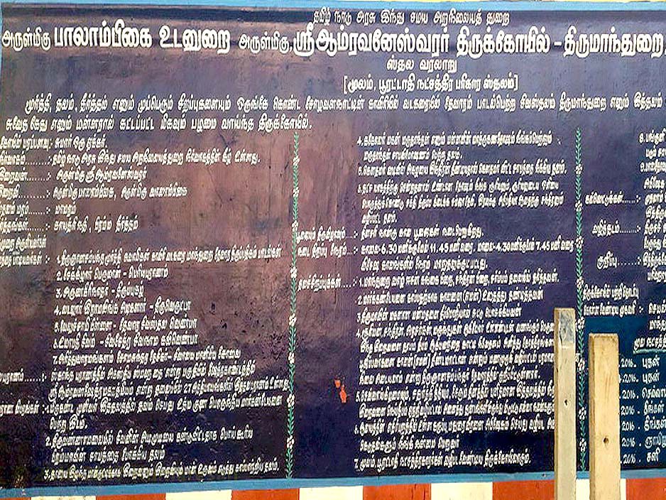 இறைவன் ஆம்ரவனேஸ்வரர் சந்நிதி கிழக்கு நோக்கி அமைந்துள்ளது. இங்கு சிவன் சுயம்பு மூர்த்தியாக அருள்பாலிக்கிறார். பங்குனி மாதத்தில் முதல் 3 நாள்களில் சூரிய ஒளி சுவாமி மீதுபடுகிறது. அம்பாள் தெற்கு நோக்கி காட்சி தருகின்றாள். ஆடிவெள்ளி, நவராத்திரி, அன்னாபிஷேகம், கார்த்திகைச் சோம வாரங்கள், திருவாதிரை, சிவராத்திரி முதலிய விழாக்கள் நடைபெறுகின்றன.