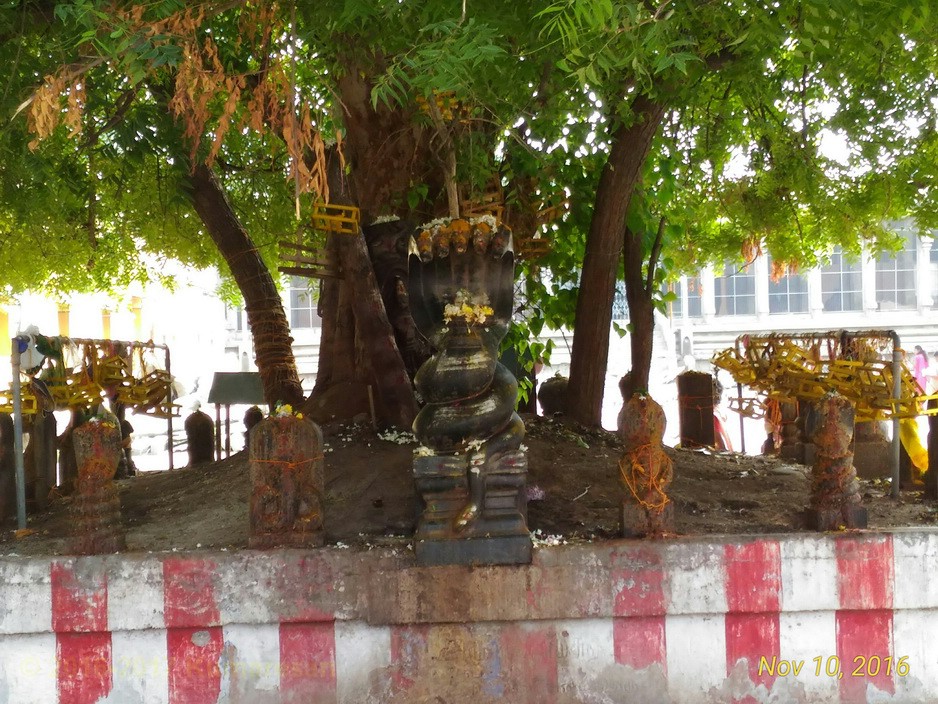 இருக்கிறார். இங்கு மட்டும் சிலாவிக்ரகமாக, பெரிய வடிவில் காட்சி தருகிறார். இவர், பத்து கரங்களுடன் ஆயுதம் ஏந்தி காட்சி தருவது விசேஷம். அருகில் சிவகாமி அம்மை இருக்கிறாள்.