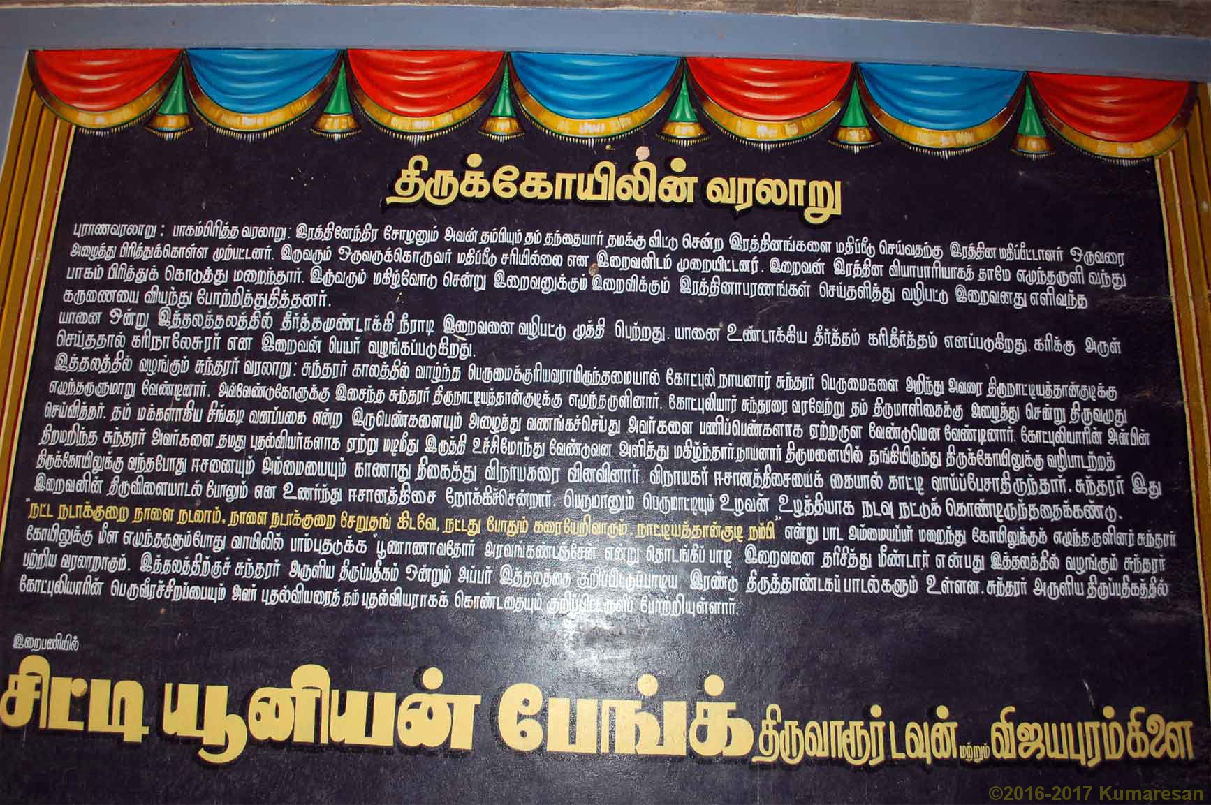 சுந்தரமூர்த்தி சுவாமிகள் இத்தலத்திற்கு வருகை தந்த போது கோட்புலி நாயனாரின் வீட்டில் தங்கி இருந்தார். அச்சமயம் இறைவனை வழிபட இருவரும் ஆலயத்திற்குச் சென்றனர். ஆலயத்தில் இறைவனையும் இறைவியையும் காணாது சுந்தரர் திகைத்தார். விநாயகரைக் கேட்க, அவர் வாய் திறந்து பேசாமல் ஈசான்ய திசையை நோக்கிக் கை காட்டினார். (கிழக்கு கோபுர வாயிலின் முன் சுந்தரருக்கு கைகாட்டிய விநாயகர் சந்நிதி மேற்கு நோக்கியுள்ளது) அவ்வழியே சுந்தரர் சென்று பார்த்த போது, அங்குள்ள ஒரு வயலில் சுவாமியும் அம்பிகையும் உழவன், உழத்தியாக நடவு நட்டுக் கொண்டிருந்ததைக் கண்டார். அதைக் கண்டு சுந்தரர், நடவு நட்டது போதும் வாரும் என்று அழைக்க, சுவாமியும் அம்பிகையும் மறைந்து கோயிலுக்குச் சென்றனர். சுந்தரர் அவர்களைப் பின் தொடர்ந்து கோவிலுக்குள் செல்லும் போது, ஒரு பாம்பு வாயிலில் தடுக்க அப்போது பூணாண் ஆவதோர் அரவங்கண் டஞ்சேன் என்று தொடங்கிப் பாடித் தரிசித்தார் என்று தலவரலாறு சொல்லப்படுகிறது. மேலும் கோட்புலி நாயனார் அவருடைய இரு புதல்விகளான சிங்கடி, வனப்பகை ஆகியோரை சுந்தருக்கு பணிப்பெண்களாக ஏற்றுக் கொள்ளும்படி வேண்ட, சுந்தரர் அந்த இருவரையும் தம் புதல்வியர்களாக ஏற்றருளிய பதி இதுவாகும்.