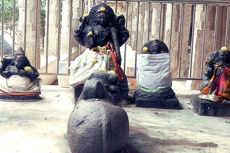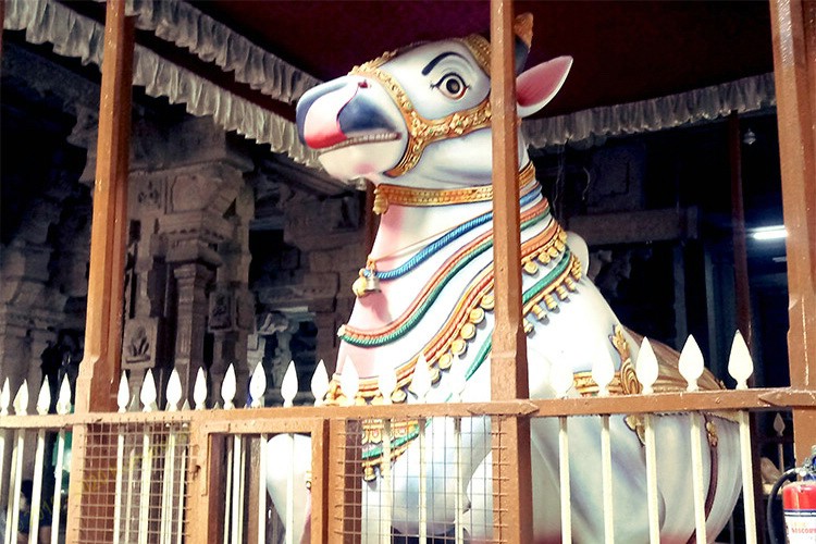 கோயிலில் நுழைந்தவுடன் 10 அடி உயரத்திற்கு மேலாக ஒரு அழகான வெள்ளை நிற நந்தியைக் காணலாம். அடுத்துள்ள கொடிமரத்தைச் சுற்றிவிட்டு உள்ளே சென்றால் மூலவரைக் காணலாம். மூலவரைக் காண்பதற்கு முன் சுமார் 9 அடி உயரம் உள்ள மிகப்பெரிய விநாயகரைத் தரிசிக்கலாம்.