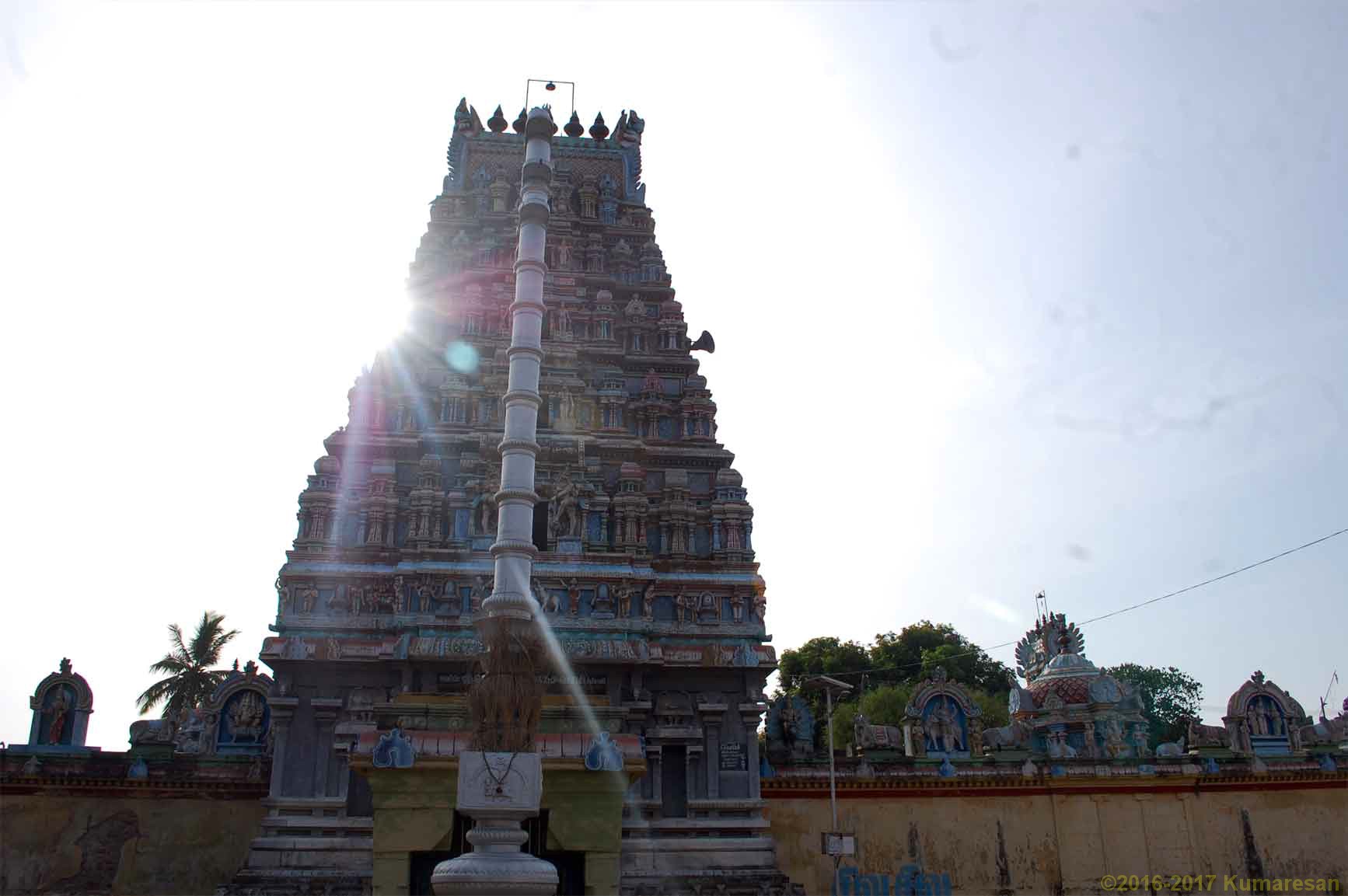 மேற்கு நோக்கிய திருக்கோயில் ஐந்து நிலைகளையுடைய ராஜகோபுரத்துடன் சுற்றிலும் மதில்கள் சூழ காட்சி அளிக்கிறது. 5 நிலை கோபுர வாயிலுக்கு வெளியே உள்ள கவசமிட்ட கொடிமரத்தையும், கொடிமர விநாயகரையும் பணிந்து, நந்தி மண்டபத்தைக் கடந்து உள்ளே செல்லலாம். பிராகாரத்தில் நால்வர், கஜலட்சுமி, விநாயகர், வள்ளி தெய்வயானை சுப்பிரமணியர், சனிபகவான், தலமரம், நெல்லி, மரத்தினடியில் நெல்லிவன நாதர், பைரவர், நவக்கிரகங்கள் முதலிய சந்நிதிகள் உள்ளன. பிரகார வலம் முடித்துப் படிகளேறி முன் மண்டபத்தை அடைந்தால் இடதுபறம் சோமாஸ்கந்தர் தரிசனம். நேரே நடராஜ சபை உள்ளது. இருபுறத்திலும் உற்சவத் திருமேனிகள் வைக்கப்பட்டுள்ளன. மண்டபத்தில் மேற்புறத்தில் நவக்கிரகங்கள், பன்னிரு ராசிகள், தசாவதாரங்கள் முதலிய சித்திரங்கள் தீட்டப்பட்டுள்ளன. மூலவர் சுயம்பு லிங்கமாக மேற்கு பார்த்தபடி அருள்பாலிக்கிறார். இத்தலத்தில் ஆண்டு தோறும் ஐப்பசி கிருஷ்ணபட்ச சதுர்த்தசி முதல் ஏழுநாளும், .மாசி மாதம் 18-ம் தேதி முதல் ஓரு வார காலத்திற்கும் மாலை வேளையில் சூரிய ஒளிக் கதிர்கள் இங்குள்ள மூலவர் மீது பட்டு சூரிய பூஜை நடக்கும். கோஷ்ட மூர்த்தங்களாக விநாயகர், தட்சிணாமூர்த்தி, பிரம்மா, துர்க்கை சந்நிதிகளும் உள்ளன. சண்டேசுவரர் உள்ளார்.