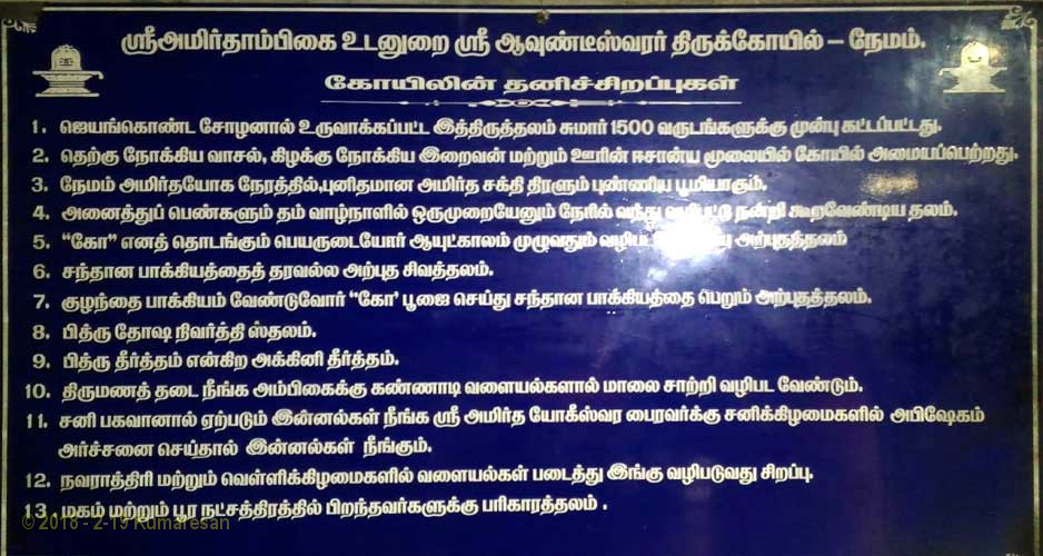 அமாவாசையில் பித்ரு லோகத்தார் யாவரும் வந்து வழிபடும் ஆலயம்! நவராத்திரி நாயகியாகப் போற்றபடும் தேவி. நேமம் ஸ்ரீ அமிர்தாம்பிகை சமேத ஸ்ரீ ஆவுண்டூ ஸ்வரர் திருக்கோயில் பல கோடி யுகங்களாக இப்பூவுலகைத் தாங்கும் அஷ்டதிக்குப் பாலகர்களும், நேமம் திருக்குளத் திர்த்தத்தில் நீராடித் தம் களைப்பை இமைப்பொழுதில் போக்கிக் கொள்ள உதவும் ஒளஷதத் தீர்த்தத் தலமாக, பிணி தீர்க்கும் அருட்பெரும் ஆலய பூமியாக, நேமம் ஸ்ரீ அமிர்தாம்பிகை சமேத ஸ்ரீ ஆவுண்டீஸ்வரர் ஆலயம் விளங்குகிறது.
