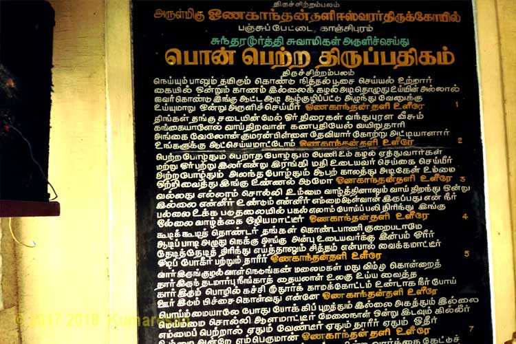 சுந்தரர் பாடிய இத்தலத்திற்கான இப்பதிகம் 7-ம் திருமுறையில் இடம் பெற்றுள்ளது. இங்கு வந்த சுந்தரர், இறைவனிடம் அடிமைத் திறம் பேசி, நெய்யும் பாலும் தயிரும் கொண்டு என்று தொடங்கும் பதிகம் பாடிப் பொன் பெற்றார் என்பது வரலாறு. இப்பதிகத்தில் ஐந்தாவது பாடலைத் தொடங்கிப் பாடும் போது, இறைவன் பக்கத்தில் உள்ள புளிய மரத்தில் சென்று ஒளிந்து கொண்டதாகவும், அதையறிந்த சுந்தரர் அங்குச் சென்று பதிகத்தை தொடரவே, இறைவன் அப்புளிய மரத்துக் காய்களையே பொன் காய்களாக விழுமாறு உதிர்க்க, சுந்தரர் அவற்றைப் பெற்றார் என்பதாக ஒரு செய்தி இப்பகுதியில் செவிவழிச் செய்தியாகச் சொல்லப்படுகின்றது.