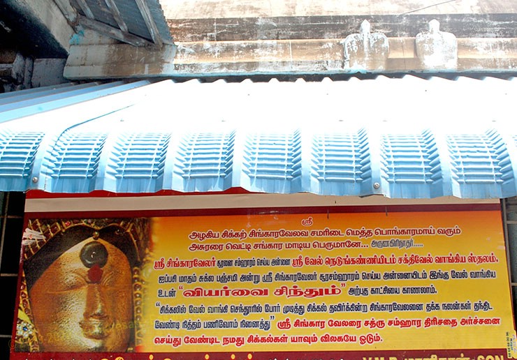 தேவர்கள், சூரபத்மனிடமிருந்து தங்களை காக்க முருகப்பெருமானிடம் வேண்டிக்கொண்டனர். இதனால் முருகப்பெருமான் சூரனை அழித்து தேவர்களை காத்தார். சிங்காரவேலனுக்கு, அம்மன் தன் சக்தியை வேலாக வழங்கிய இத்தல முருகனுக்கு அர்ச்சனை செய்தால் எதிரிகள் தொந்தரவு விலகி நலம் விளையும் என்பது நம்பிக்கை.