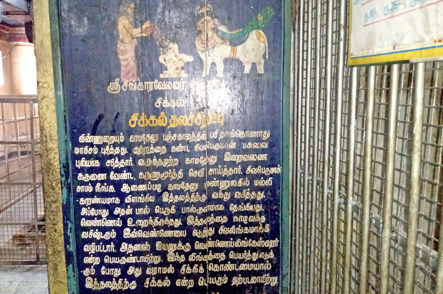 பூஜையை முடித்த பின் அந்த சிவலிங்கத்தை வேறு இடத்தில் வைக்க எண்ணி அதை எடுக்க முயன்றார் அது முடியவில்லை, இதனாலேயே இத்தலம் சிக்கல் என்ற பெயருடன் விளங்குகிறது, வசிஷ்டமுனிவர் வெண்ணையை எடுத்து பூஜை செய்ததால் இத்தல இறைவன் வெண்ணெய்நாதர் ஆனார்.