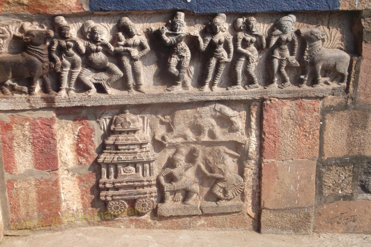 இதே போன்று திருக்கோடீஸ்வரரின் கருவறை வெளிச்சுவற்றிலும் அழகிய சிற்பகோலங்கள் உள்ளன. தெற்குச் சுவரில் முதலில் நடராஜர் சிற்பம் உள்ளது. இடதுபுறம் சிவகாமியும், வலதுபுறம் காரைக்கால் அம்மையார் பேய் உருவில் தலைவிரி கோலமாய் தாளமிட்டப்படி சிவனது கூற்றினைக் கண்டு ஆனந்திக்கிறாள். திருவடியின் கீழ் இசைபாடுவோர். மத்தளம் அடிப்போர், தாளமிடுவோர் என மூன்று கணங்கள் உள்ளனர். அடுத்து வரிசையாக பிட்சாடனர், விஷ்ணுவின் மோகினி அவதாரம், ஒரு குள்ளபூதம், அமர்ந்த நிலையில் மஹா கணபதி, அகத்திய முனிவர், தட்சிணாமூர்த்தி, அத்ரி முனிவர், பிருகு முனிவர் உள்ளார்கள். விமானத்தில் பிட்சாடனர் உருவம் எட்டு கரங்களுடன் சூலம் ஏந்தி அகோர தாண்டவமூர்த்தியாய் மிக நுணுக்கமான சிற்ப வேலைப்பாடுகளுடன் காணப்படுகிறது. ஸ்வாமியின் கருவறை மேற்குச் சுவற்றில் லிங்கோத்பவர், மகாவிஷ்ணு நின்ற கோலம் அவருக்கு இருபுறமும் குத்ச முனிவரும் வசிஷ்டமுனிவரும் உள்ளனர். விமானத்தில் மகாவிஷ்ணு அமர்ந்த கோலத்தில் காணப்படுகிறார். வடக்குத் கருவறை சுவற்றில் முதலில் கௌதம மகரிஷியும் அடுத்து பிரம்மாவும், தொடர்ந்து காஸ்யப ரிஷி, அஷ்டபுஷ துர்க்கை, அர்த்தநாரீஸ்வரர் உள்ளனர். விமானத்தில் பரமேஸ்வரன் காட்சி அளிக்கிறார். கிழக்குபுற விமானத்தில் ஸ்வாமி மற்றும் அம்பாள் சிற்பம் அமைந்துள்ளது.
