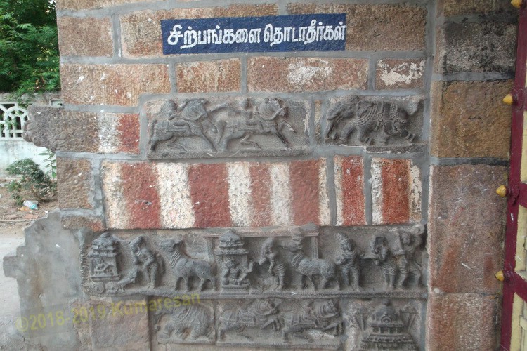 ஆலயத்தில் சிற்பங்களுக்கு பஞ்சமில்லை. சிவபெருமானின் 64 லீலைகளில் பெரும்பான்மைகளை மிக நுட்பமாக பல்லவகால சிற்ப அமைவில் திருச்சுற்றிலும் ஏனைய பல இடங்களிலும் காணமுடிகிறது. சிற்பங்கள் யாவும் வெகு அற்புதமாய் கண்ணைக்கவரும் விதத்தில் அமைத்திருக்கின்றன. இராஜகோபுர வாயிலில் காமதேனு, கற்பக விருட்சம், குதிரை மற்றும் யானை வீரர்களின் போர்க்காட்சிகள், மனுநீதி சோழன் நீதிவரலாறு, கண்ணனின் கோகுல லீலைகள், மிக நுணுக்கமாக செதுக்கப்பட்ட 22 விதவிதமான வாத்தியங்களை இசைக்கும் மாந்தர்கள் யாவும் கண்ணிற்கு விருந்தாய் அமைந்துள்ளன.