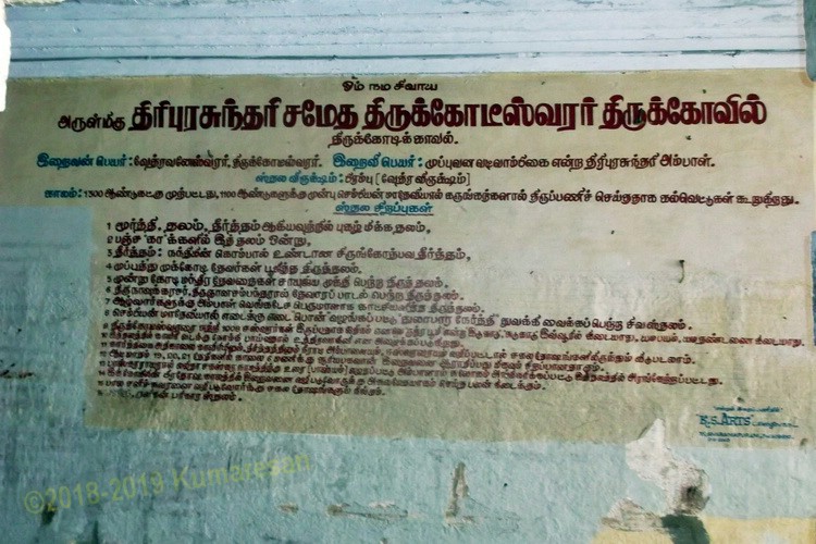 ஒரு சமயம் கைலாசத்தையும், திருகோடிக்காவையும் ஒரு தராசில் வைத்துப் பார்த்த போது, இத்தலம் உயர்ந்து, கைலாசம் கீழே போய்விட்டது. என்னுடைய திருமேனிக்கு சமமான பெருமை கொண்ட தலம் இது என்று சிவபெருமானால் சிலாகித்து கூறப்பட்ட தலம்.