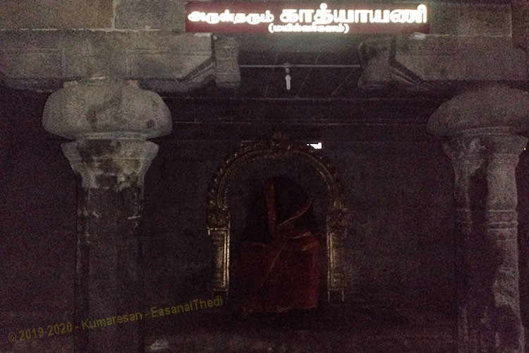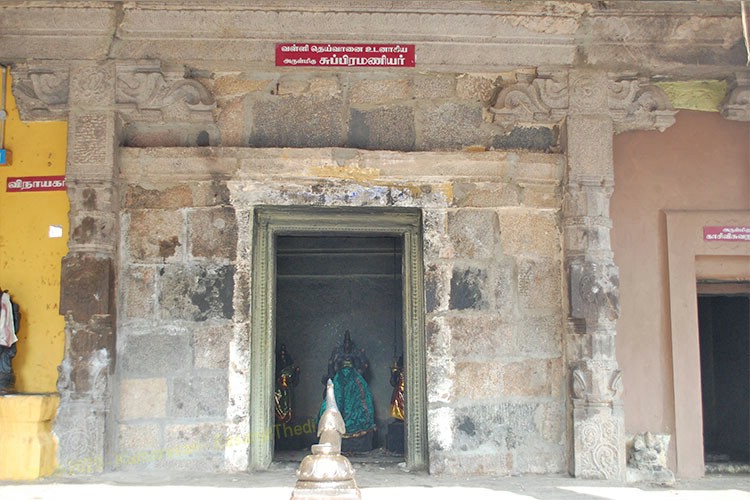 இரு அம்பாள் சந்நிதிகள் உள்ளன. பாலாம்பிகை சந்நிதி தெற்கு நோக்கியுள்ளது. கருவறை மேற்குச் சுற்றில் வள்ளி தெய்வானையுடன் முருகர் காட்சி தருகிறார். இந்த கோவிலின் தல விருட்சம் பனை மரம், மேலும் இங்கு உள்ள குளத்திற்கு மருத்துவ குணம் இருப்பதால் இதில் நீராடுவோர்க்கு தோல் சம்பந்தமான நோய்கள் குணமாவதாக நம்பிக்கை இருக்கிறது. இது மட்டுமல்லாமல் மயிலாடுதுறைக்கு அருகில் உள்ள வைதீஸ்வரன் தலத்திற்கு எவரேனும் நேர்த்தி கடன் இருந்தால் அதை இந்த கோவிலிலே நிறைவேற்றலாம் என்பதும் இத்தல சிறப்பாகும். காத்தியாயினி அம்மன் சன்னதியும் இருக்கிறது. இந்தக் கோயிலில் காத்தியாயினி அம்மனும் மயில் வாகனத்தில் காட்சி தருவது குறிப்பிடத்தக்க விசேஷம். இந்தக் கோயிலில் விநாயகர் தெற்குப் பார்த்துக் காட்சி தருகிறார். முற்காலத்தில் உத்தரவாகினியாகப் பாய்ந்த ஆற்றை தெற்கு நோக்கி, தெற்குப் பக்கமாகத் திருப்பியதாகவும் அதன் காரணமாகவே விநாயகர் தெற்குப் பார்த்துக் காட்சி தருவதாகவும் சொல்லப்படுகிறது