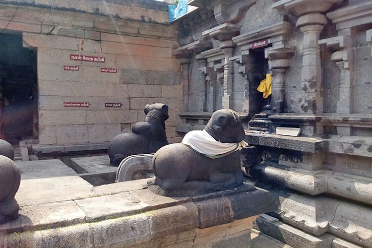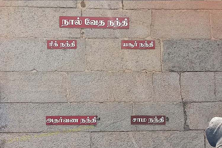 இங்குள்ள பிரம்மனுக்கு எதிரில் நான்கு வேதங்களும் நான்கு நந்திகளாக அமர்ந்துள்ளன.