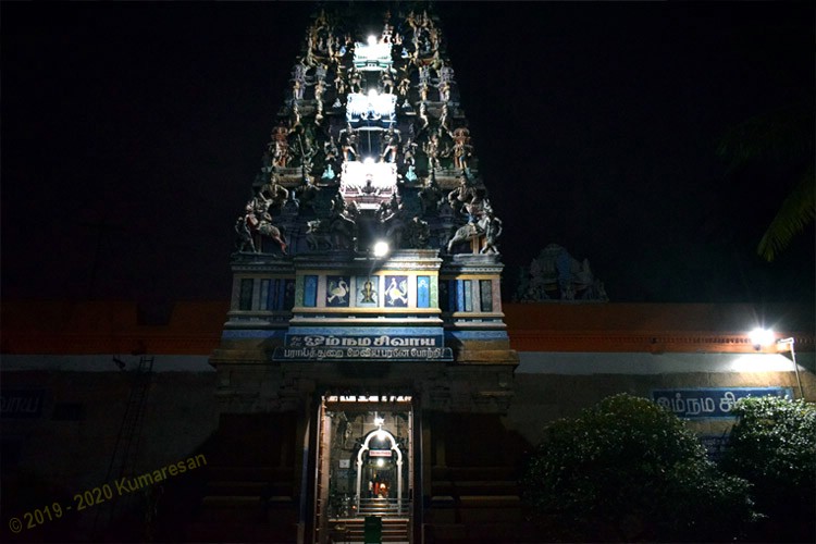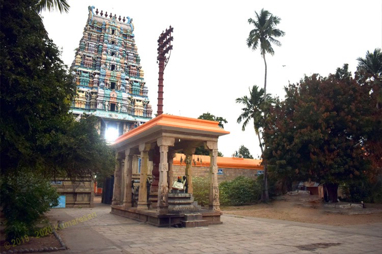 நேரே இராஜகோபுரம் ஏழு நிலைகளுடன் உள்ளது. முகப்பில் விநாயகர் காட்சி தருகிறார். இராஜகோபுர வழி உள் நுழைந்தால் நேரே செப்புக் கவசமிட்ட கொடிமரம். இதுவும் பலிபீடமும் நந்தியும் சேர்த்து ஒரு மண்டபத்தில் உள்ளன. இது நந்தி மண்டபம் எனப்படும். இத்தூண்களில் சம்பந்தர், அப்பர், மாணிக்கவாசகர் உருவங்களும், திருப்பணி செய்த செட்டியாரின் உருவமும் உள்ளன. வெளிப்பிராகாரத்தில் விநாயகரும் தண்டபாணியும் உள்ளனர்.