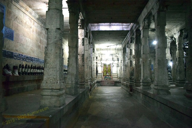 அடுத்துள்ள கோபுரம் ஐந்து நிலைகளையுடையது. உள்ளே நுழைந்ததும் நேரே கிழக்கு நோக்கிய மூலவர் சந்நிதி தெரிகின்றது. உள்சுற்றில் வலம்புரி விநாயகரும், சப்தகன்னியரும், 63 மூவரும் உள்ளனர். அடுத்து சோமாஸ்கந்தர், மகா கணபதி, பஞ்சபூத லிங்கங்கள், ஆறுமுகர், பிட்சாடனர், பிரம்மா, துர்க்கை, கஜலட்சுமி, சண்முகர் ஆகியோர் சந்நிதிகள் உள்ளன. நவக்கிரகங்களுள் சனீஸ்வரனுக்கு மட்டும் காக்கை வாகனமுள்ளது. பைரவரும் உள்ளார்.