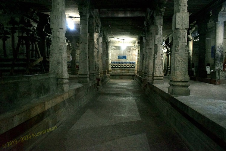 கோஷ்ட மூர்த்தங்களாக விநாயகரும், தட்சிணாமூர்த்தியும், இலிங்கோத்பவர் இடத்தில் அர்த்தநாரீஸ்வரரும், பிரம்மாவும், துர்க்கையும் உள்ளனர். சண்டேசுவரர் சந்நிதி உள்ளது. சிங்கங்கள் தாங்கி நிற்கின்ற அழகிய வேலைப்பாடமைந்த தூண்கள் - பரந்த கல்லால மர வேலைப்பாடுடன் உள்ளன. நடராசர் சந்நிதியும் இங்குள்ளது. துவாரபாலகர்களைத் தரிசித்து உட்சென்று மூவலரைத் தரிசிக்கலாம். மூலவர் அழகான திருமேனி. அம்பாள் சந்நிதி தெற்கு நோக்கியது. அம்பாள் மண்டபத்தில் உள்ள முன்தூணில் ஊர்த்துவ தாண்டவ சிற்பமும், எதிர்த் தூணில் காளியின் சிற்பமும் உள்ளன.