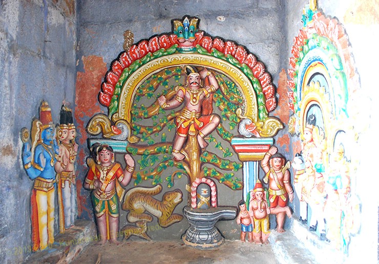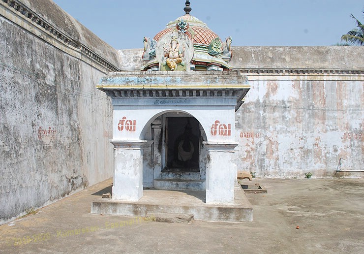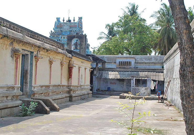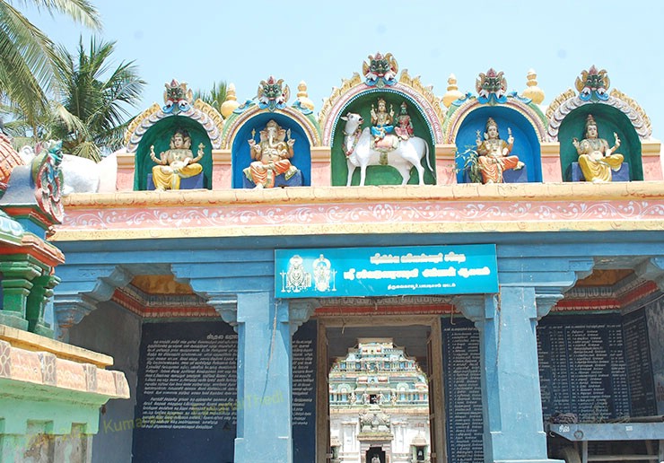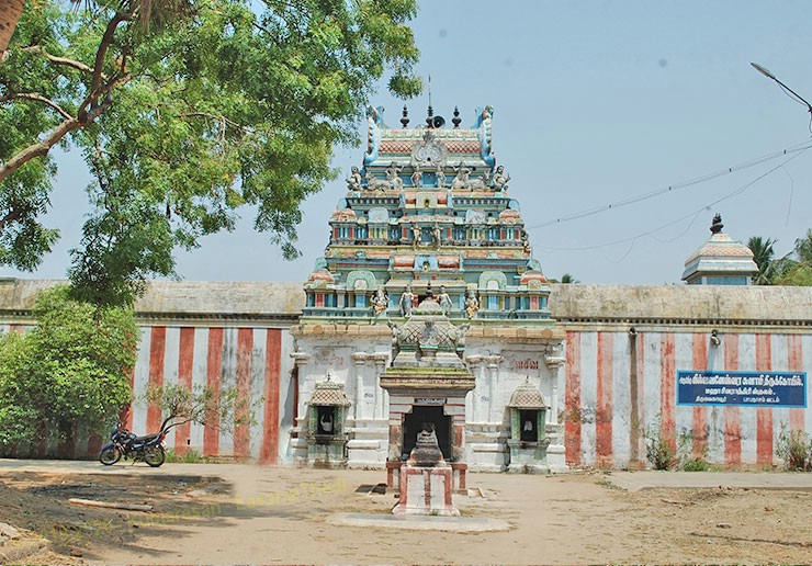 இத்தலத்தில் ராஜகோபுரம் இல்லை. முகப்பில் விநாயகர் காட்சி தருகின்றார். முகப்பு வாயில் மட்டுமே ஐந்து கலசங்களுடன் கிழக்கு நோக்கி காட்சி தருகிறது. முகப்பு வாயிலின் மேற்புறம் அழகிய சுதைச் சிற்பங்கள் காணப்படுகின்றன. முகப்பு வாயிலுக்கு எதிரே யம தீர்த்தம் உள்ளது. வாயில் வழியே உள்ளே சென்றால் பலிபீடத்தையும், நந்தி நம்மைநோக்கி திரும்பி (கிழக்குநோக்கி) இருப்பதைக் காணலாம். இவற்றையடுத்து சுற்றிலும் மதிற்சுவருடனுள்ள ஒரு சிறிய 3 நிலை கோபுரம் உள்ளது. கோபுர வாயில் வழியே உள்ளே சென்றால் வாயிலில் இடப்பால் வேடன் நிகழ்ச்சி கதையால் சித்தரிக்கப்பட்டிருப்பதைக் கண்டு மகிழலாம்.