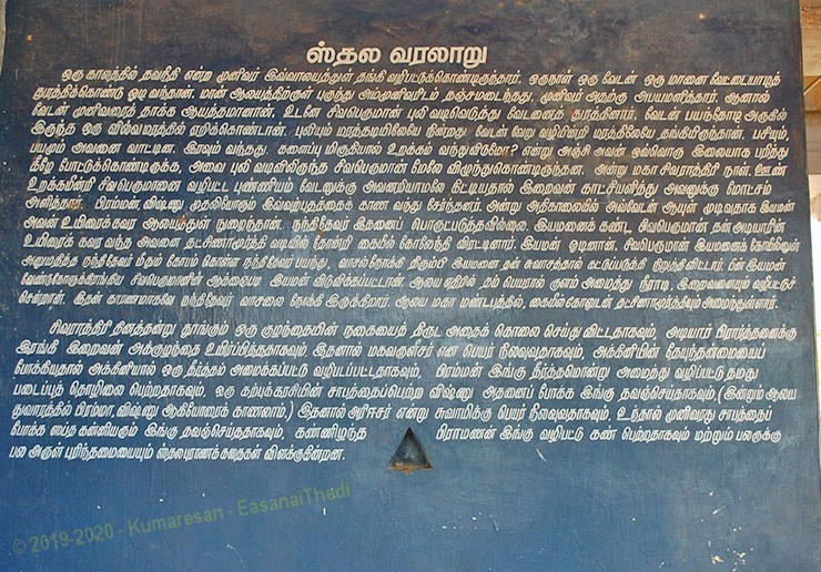 அடியார்களை எப்போதும் காக்கும் இறைவன் ஒரு புலி வடிவில் அங்கு தோன்றி வேடனை துரத்தினார். வேடன் அருகிலுள்ள மரத்தின் மீது ஏறிக் கொண்டான். புலியும், விடுவதில்லை என்பது போல மரத்தடியிலேயே நின்றது. வேடன் வேறுவழியின்றி மரத்திலேயே இரவு முழுதும் தங்கியிருந்தான், இரவு வந்துவிட, பயத்தினாலும், பசியினாலும் வேடன் தூங்காமல் மரத்தில் கண் விழித்து உட்கார்ந்திருந்தான், மரத்தின் ஒவ்வொரு இலையாக பறித்து கீழே போட்டுக் கொண்டிருக்க அவை புலி வடிவிலிருந்த சிவபெருமான் மீது விழுந்து கொண்டிருந்தன.அன்று மகாசிவராத்திரி தினம். அவன் உட்கார்ந்திருந்த மரம் விலவமரம்.