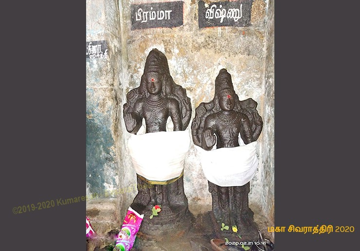 இத்தலத்தில் பிரம்மாவும், மகாவிஷ்ணுவும் துவாரபாலகர்களாக விளங்குகிறார்கள். பிரளய காலத்தில் தன்னுடைய ஆக்கும் தொழில் அழியாமல் இருக்க பிரம்மா இங்கே ஒரு கேணி உண்டாக்கி சிவபெருமானை வழிபட்டபின் ஆலய துவாரகாலகனாக ஒருபுறம் அமர்ந்து விட்டார். சலந்திரனை அழிப்பதற்காக அவன் மனைவியிடம் ஒரு பொய் கூறினார் திருமால். இதை அறிந்து கொண்ட அவள் மகாவிஷ்ணுவை சபித்தாள். அச்சாபம் தீரவே திருமால் இங்கே துவாரபாலகனாக நின்று தவம் புரிகிறார் என்கிறது தலபுராணம்.