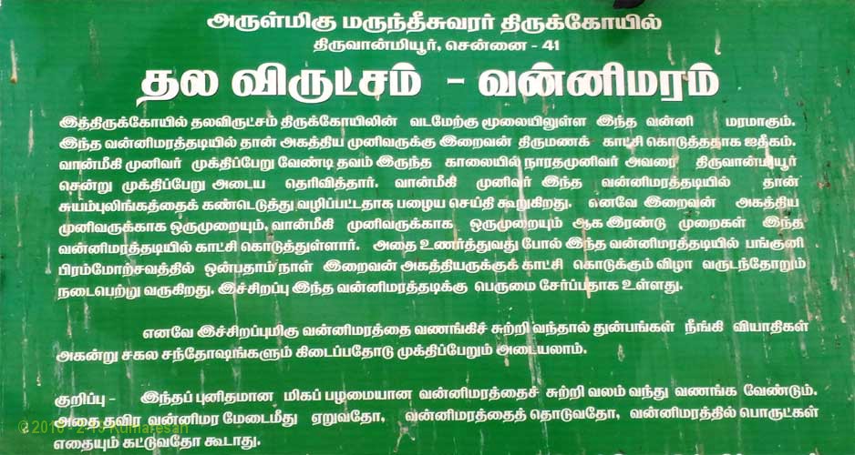 ஆலயத்தின் வெளிப் பிரகாரத்தில் வடமேற்கு மூலையில் உள்ள வன்னி மரமே இத்தலத்தின் தல விருட்சமாகும். இந்த வன்னி மரத்தினடியில் தான் அகத்தியருக்கு இறைவன் திருமணக் காட்சி கொடுத்ததாக ஐதீகம். வான்மீகி முக்திப் பேறு வேண்டி நாரதரின் ஆலோசனைப் படி இத்தலம் வந்து இந்த வன்னி மரத்தடியில் தான் சுயம்பு லிங்கத்தைக் கண்டெடுத்து வழிபட்டதாக புராண செய்திகள் கூறுகின்றன. அகத்திய முனிவருக்காக ஒரு முறையும், வான்மீகி முனிவருக்காக ஒரு முறையும் ஆக இரண்டு முறை இறைவன் இந்த வன்னி மரத்தடியில் காட்சி கொடுத்துள்ளார். இந்த வன்னி மரத்தடியில் பங்குனி மாத பிரம்மோற்சவத்தில் ஒன்பதாம் நாள் இறைவன் அகத்தியருக்கு திருமணக் காட்சி கொடுத்த விழா ஆண்டுதோறும் நடைபெற்று வருகிறது.