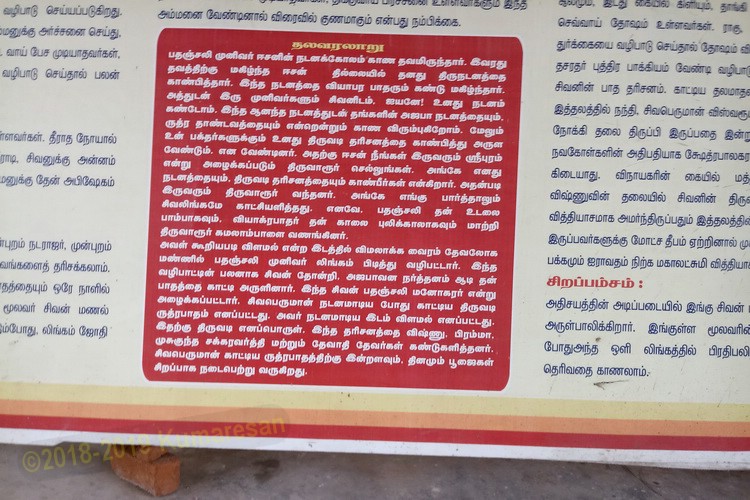 தசரதர் புத்திர பாக்கியம் வேண்டி வழிபாடு செய்த தலங்களுள் இதுவும் ஒன்று.சிவனின் பாத தரிசனம் காட்டிய தலமாதலால் இங்கு நவகிரகங்கள் கிடையாது. இத்தலத்தில் நந்தி, சிவபெருமான் விஸ்வரூபம் எடுத்து ஆடிய வடகிழக்கு திசையை நோக்கி தலை திருப்பி இருப்பதை இன்றும் காணலாம். பைரவர் இத்தலத்தில் நவகோள்களின் அதிபதியாக க்ஷேத்ரபாலகராக இருப்பதால் இங்கு நவகிரக சன்னதி கிடையாது. விநாயகரின் கையில் மத்தக மணியுடன் அருள்பாலிக்கிறார். விஷ்ணுவின் தலையில் சிவனின் திருவடி இருப்பதும், எம சண்டிகேஸ்வரர் வித்தியாசமாக அமர்ந்திருப்பதும் இத்தலத்தின் சிறப்பம்சமாகும். இறக்கும் தருவாயில் இருப்பவர்களுக்கு மோட்ச தீபம் ஏற்றினால் முக்தி கிடைக்கும் என்பது ஐதீகம். இரண்டு பக்கமும் ஐராவதம் நிற்க, மகாலட்சுமி வித்தியாசமான கோலத்தில் அமர்ந்திருக்கிறாள்.