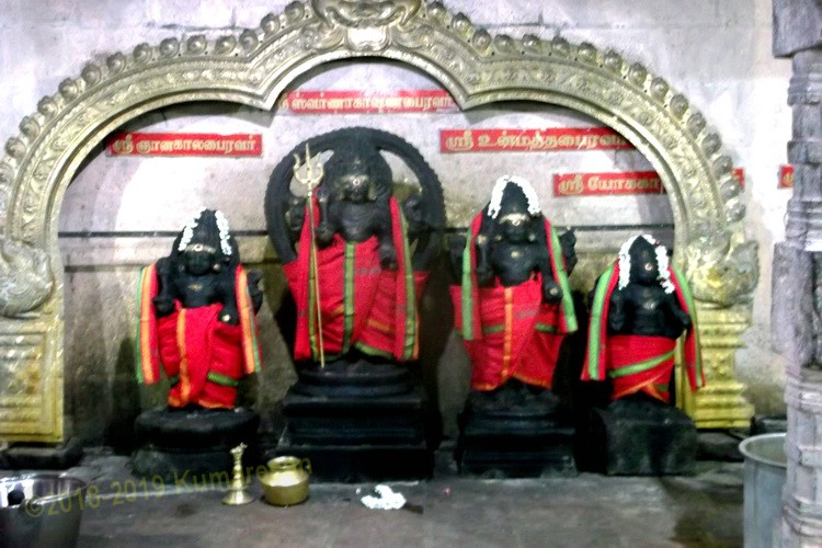 இங்குள்ள பைரவர் சதுர்கால பைரவர் என அழைக்கப்படுகிறார். யுகத்திற்கு ஒரு பைரவராக தோன்றி இங்கு அருள்பாலிக்கின்றனர். ஞானகால பைரவர் அருகில் தெட்சிணாமூர்த்தியும், சொர்ணாகர்ஷன பைரவர் அருகில் மகாலட்சுமியும், உன்மத்த பைரவர் அருகில் பாலசனியும் உள்ளனர். யோக பைரவர் அருகில் உத்திரகைலாய லிங்கம் இருக்கிறது. இவர்களை அஷ்டமி திதியில் வழிபடுவது சிறப்பு.