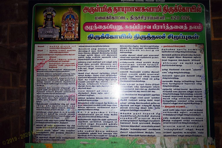 திருச்சியின் மிகப்புகழ் வாய்ந்த அடையாளச் சின்னமாக விளங்குவது மலைக்கோட்டை. இது உச்சிப்பிள்ளையார் கோவில் என்றும் அழைக்கப்படுகிறது. இது 275 அடி உயர மலையின் மேல் அமைந்துள்ளது. மலையின் பாதி தூரத்தில் சிவனுக்கு அர்ப்பணிக்கப்பட்ட தாயுமானவர் சுவாமி கோவில் ஒன்று உள்ளது. இந்த உச்சி பிள்ளையார் கோவிலில் 100 கால் மண்டபம், விமானம், மூன்றாம் நூற்றாண்டைச் சேர்ந்த கல்வெட்டுக்கள் உள்ளன.