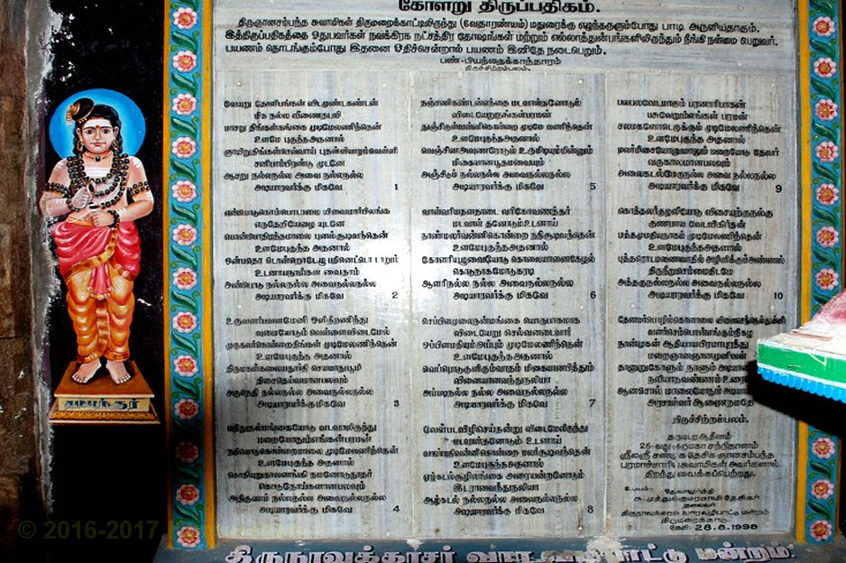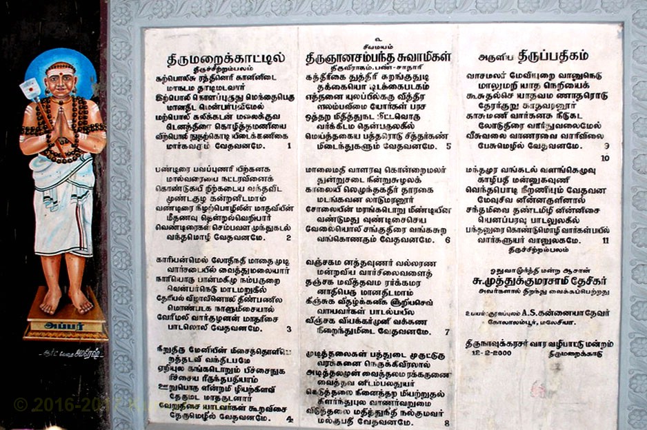 ஒருமுறை திருநாவுக்கரசரும், திருஞானசம்பந்தரும் திருமறைக்காட்டிற்கு வருகை புரிந்தனர். ஊர் மக்கள் யாவரும் சிறிய திட்டிவாசல் வழியாக கோவிலின் உள்ளே செல்வதையும், கோவிலின் முன்கதவுகள் மூடி இருப்பதையும் பார்த்து விபரம் கேட்டனர். வேதங்கள் பூஜித்து மூடிவிட்டுப் போயிருந்த கதவுகளை பதிகம் பாடி திருநாவுக்கரசர் திறக்கவும், திருஞானசம்பந்தர் பதிகம் பாடி திறந்த கதவை மூடவும் செய்த அற்புதம் நிகழ்ந்த தலம் திருமறைக்காடு. அப்பரும் சம்பந்தரும் பதிகம் பாடி மூடிய கதவை திறக்கவும் மூடவும் செய்த நிகழ்ச்சி இத்தலத்தில் பிரம்மோத்சவ விழாவாக மாசி மாதத்தில் கொண்டாடப்படுகிறது.இத்தலத்தில் தான் திருஞானசம்பந்தர் கோளறு திருப்பதிகம் பாடியருளினார். பாண்டிய நாட்டு அரசி மங்கையர்க்கரசி பாண்டிய நாடு வரவேண்டும் என்று சம்பந்தருக்கு அழைப்பு விட்டார். மதுரை செல்வதற்கு முன் திருமறைக்காட்டில் தங்கியிருந்த திருநாவுக்கரசரிடம் கூறிவிட்டுப் போக வந்தார். மதுரையில் உள்ள சமணர்கள் கொடுந்தொழில் செய்பவர்களென்றும் தற்போது நாளும் கோளும் நன்றாக இல்லையென்று சொல்லி சம்பந்தர் மதுரை செல்ல வேண்டாம் என்று அறிவுரை கூறினார். அதற்கு சம்பந்தர் சிவபெருமானை வழிபடும் அடியார்களுக்கு நாளும் கோளும் நன்மையே செய்யும் இடர் செய்யாது என்று கூறி திருப்பதிகம் பாடியருளினார்.