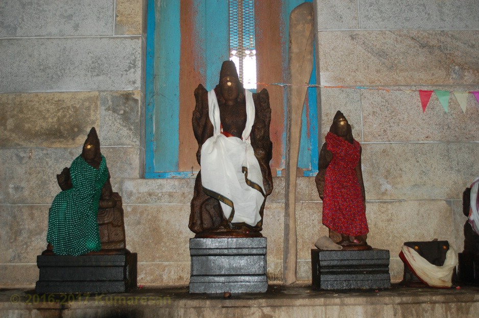 அம்பாள் நின்ற திருக்கோலத்தில் தெற்கு நோக்கி அருட்காட்சி தருகிறாள். சந்நிதிகளின் எதிரில் உள்ள தூண்களில் இத்திருக்கோயிலில் திருப்பணியைச் செய்வித்த நகரத்துச் செட்டியார் உருவங்கள் உள்ளன. துவாரபாலகர்களையும் துவார விநாயகரையும் முருகனையும் தரிசித்து மூலவர் மண்டபத்தை அடையலாம். நேரே மூலவர் தரிசனம். இத்தல இறைவன் சுயம்பு லிங்கமாக அருள்பாலிக்கிறார். கோஷ்டமூர்த்தங்களாக நர்த்தன விநாயகர், தட்சிணாமூர்த்தி, இலிங்கோத்பவர், பிரம்மா, துர்க்கை ஆகியோர் உள்ளனர். சண்டேஸ்வரர் தனி சந்நிதியில் எழுந்தருளியுள்ளார்.